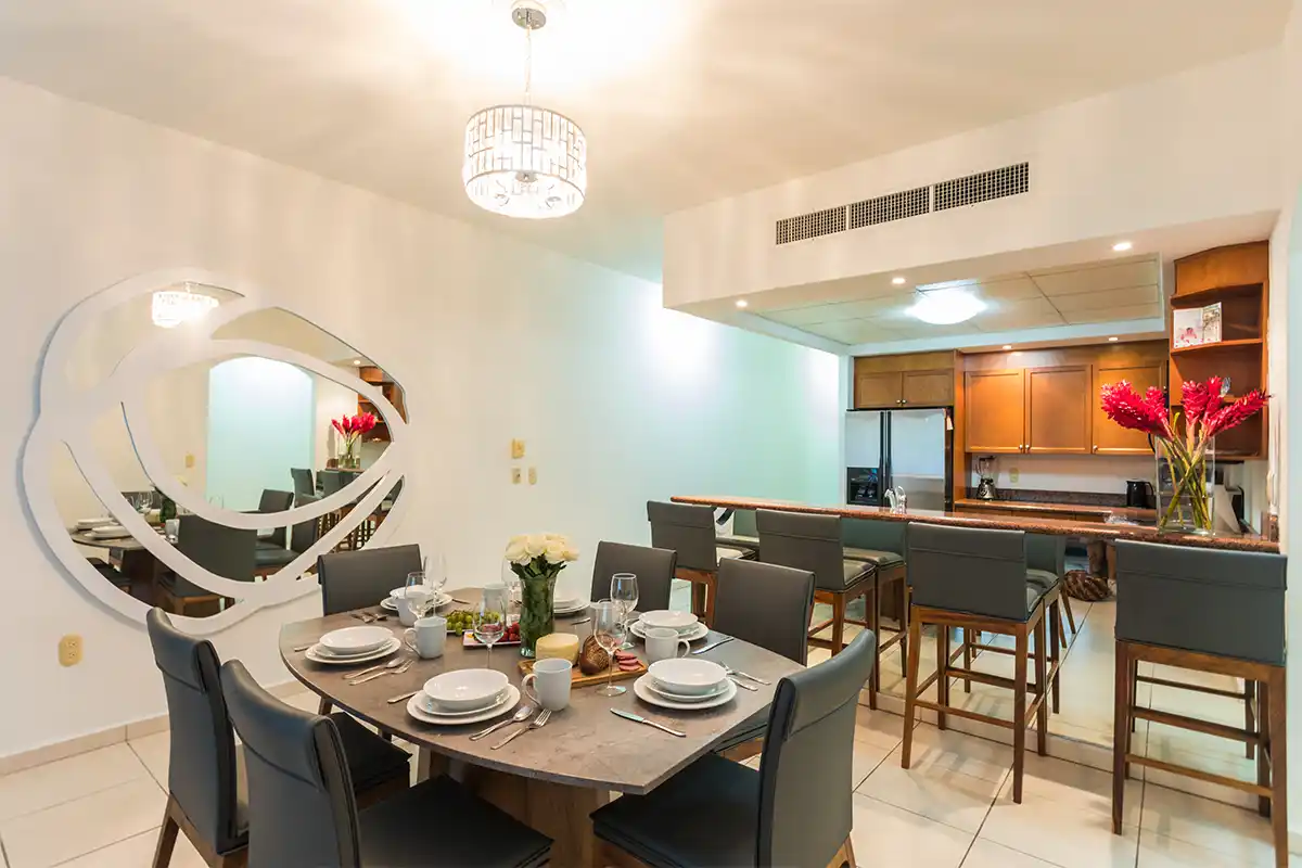 This apartment has a living room with a large TV screen with cable TV, a beautiful dining room for 6 people where you can enjoy delicious food, gatherings, and board games. The balcony offers a nice dining area and a lovely double sunbed to enjoy the sunsets of Nuevo Vallarta from your balcony.